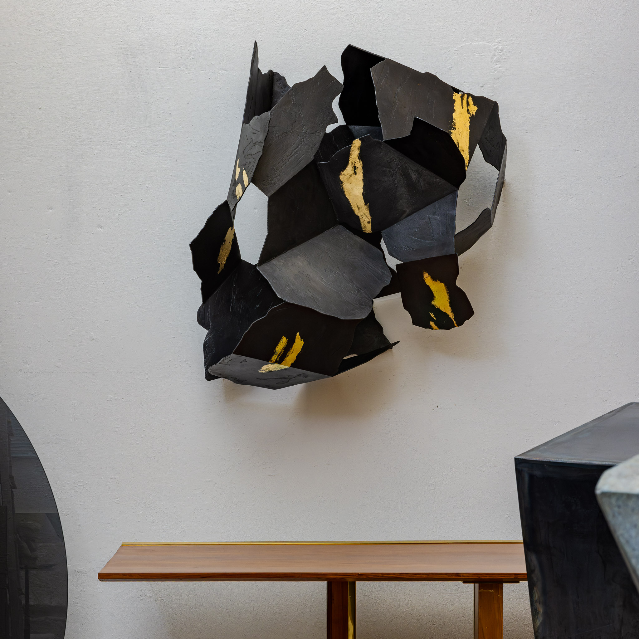 My practice as a sculptor is intuitive and driven by the organic encounter between the materials I use: steel, stone, brass and mirror.