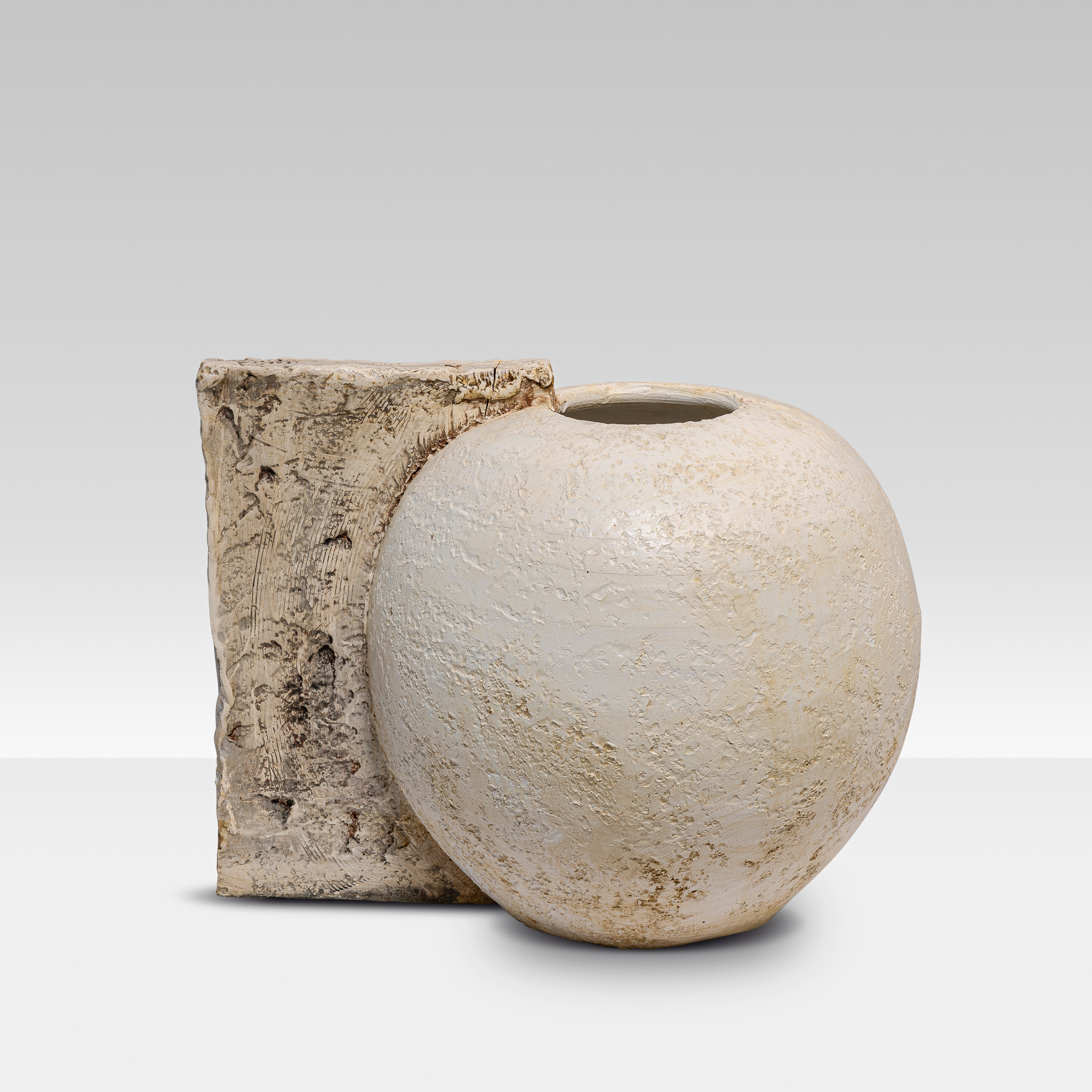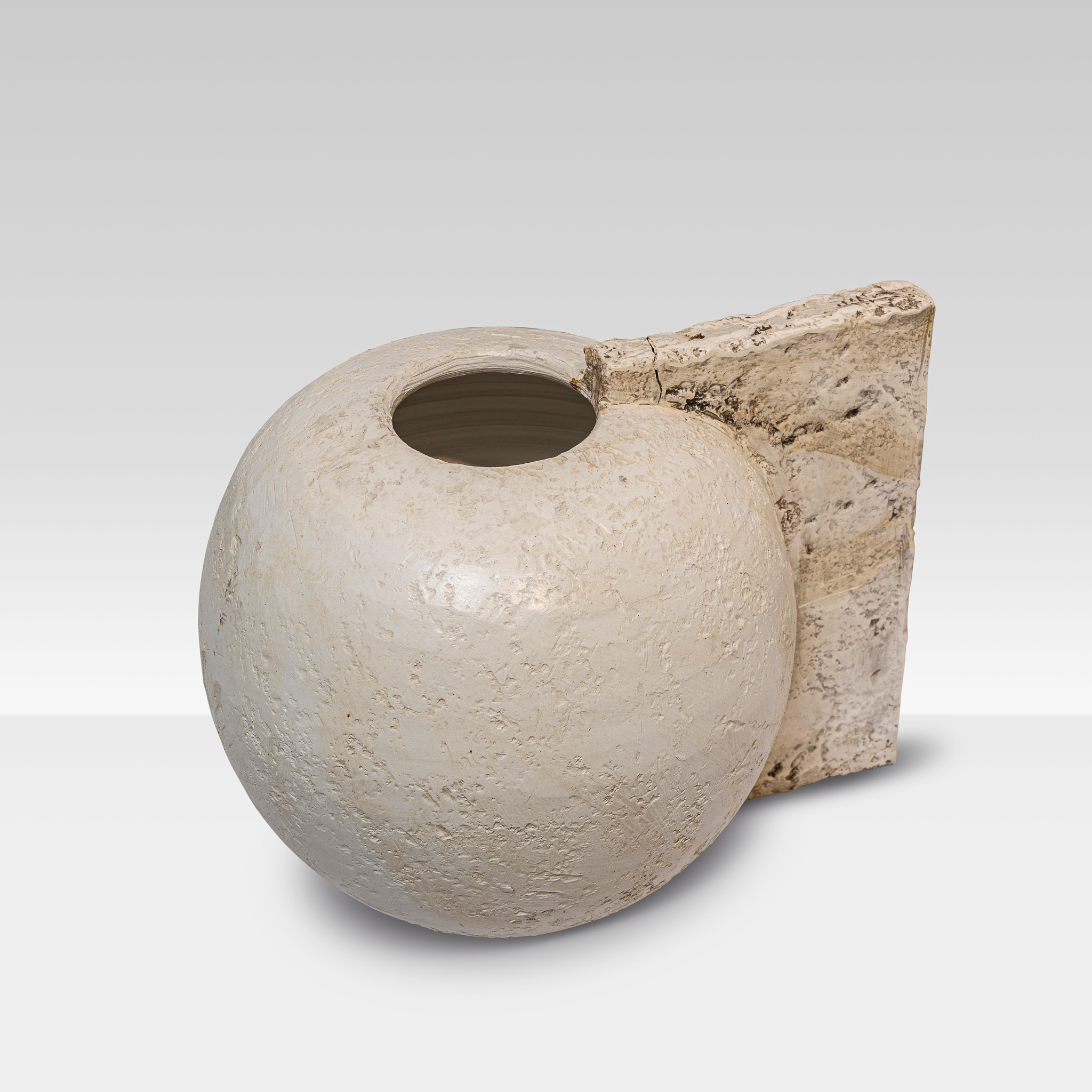 One of a kind artistic vase in ivory glazed and raw ceramic.
