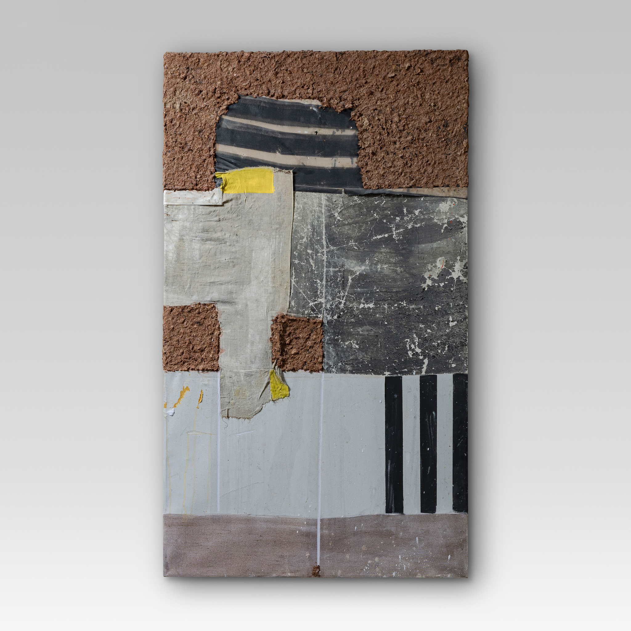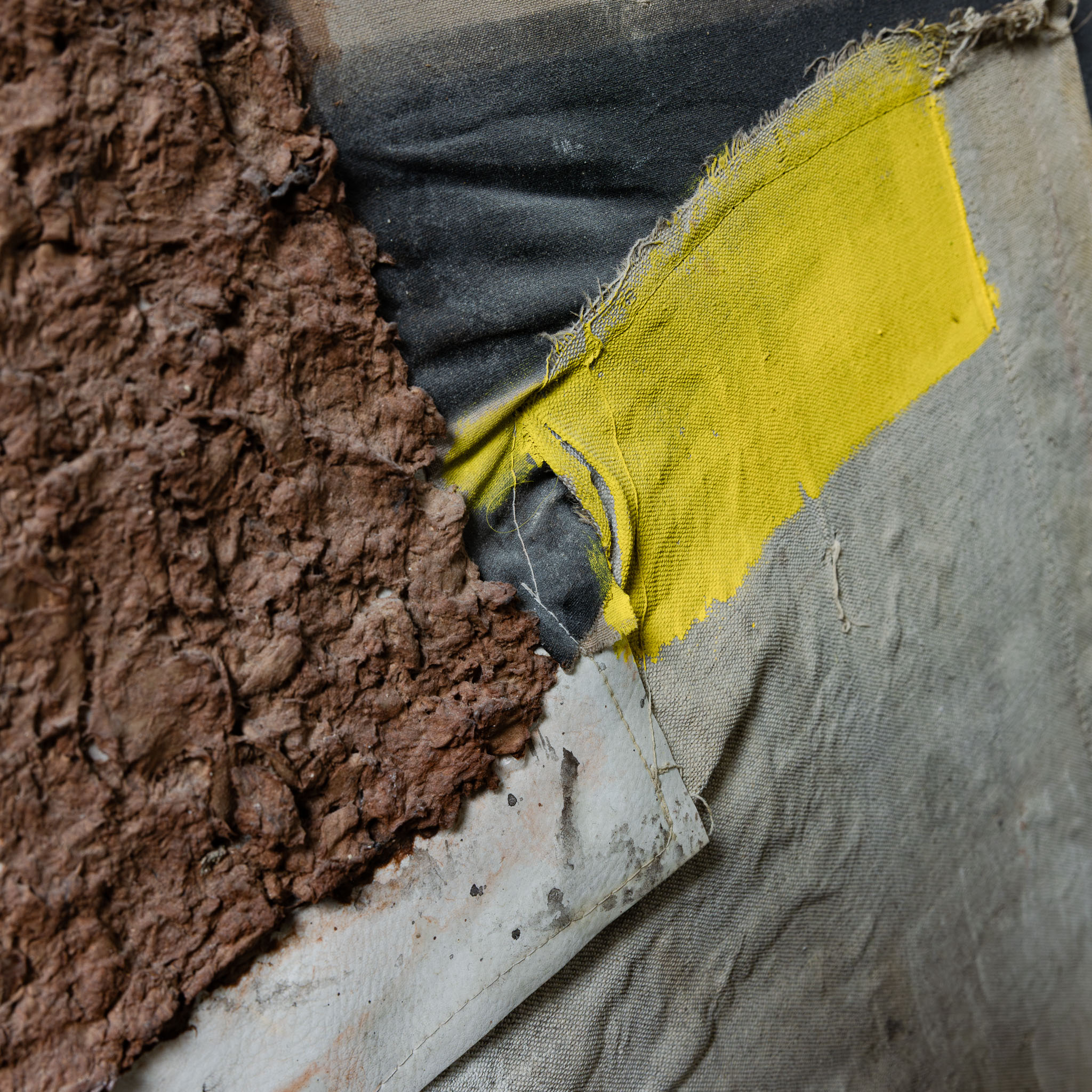 Mixed media abstract wall artwork on canvas, fabric, papier machè and acrylics.